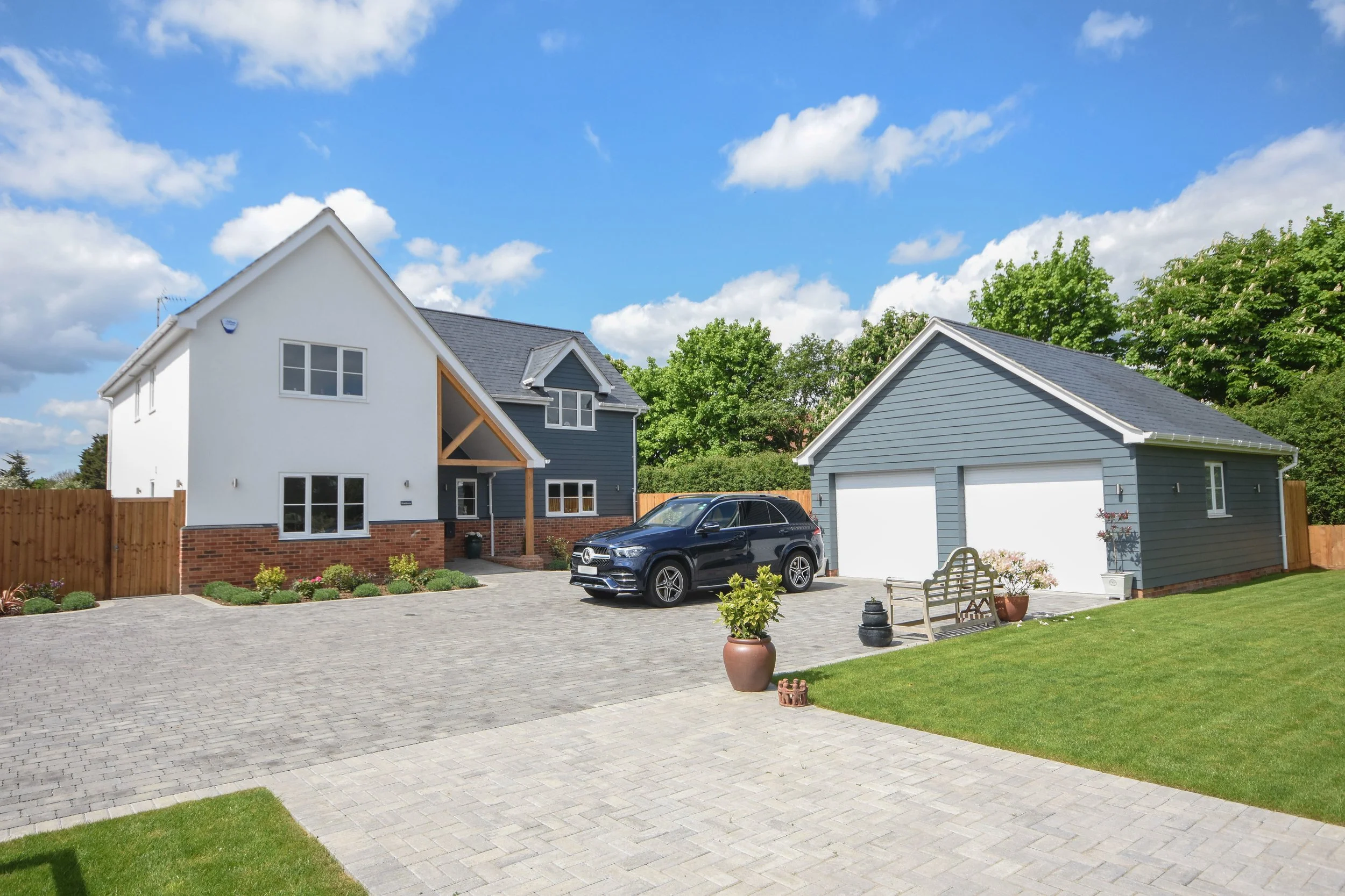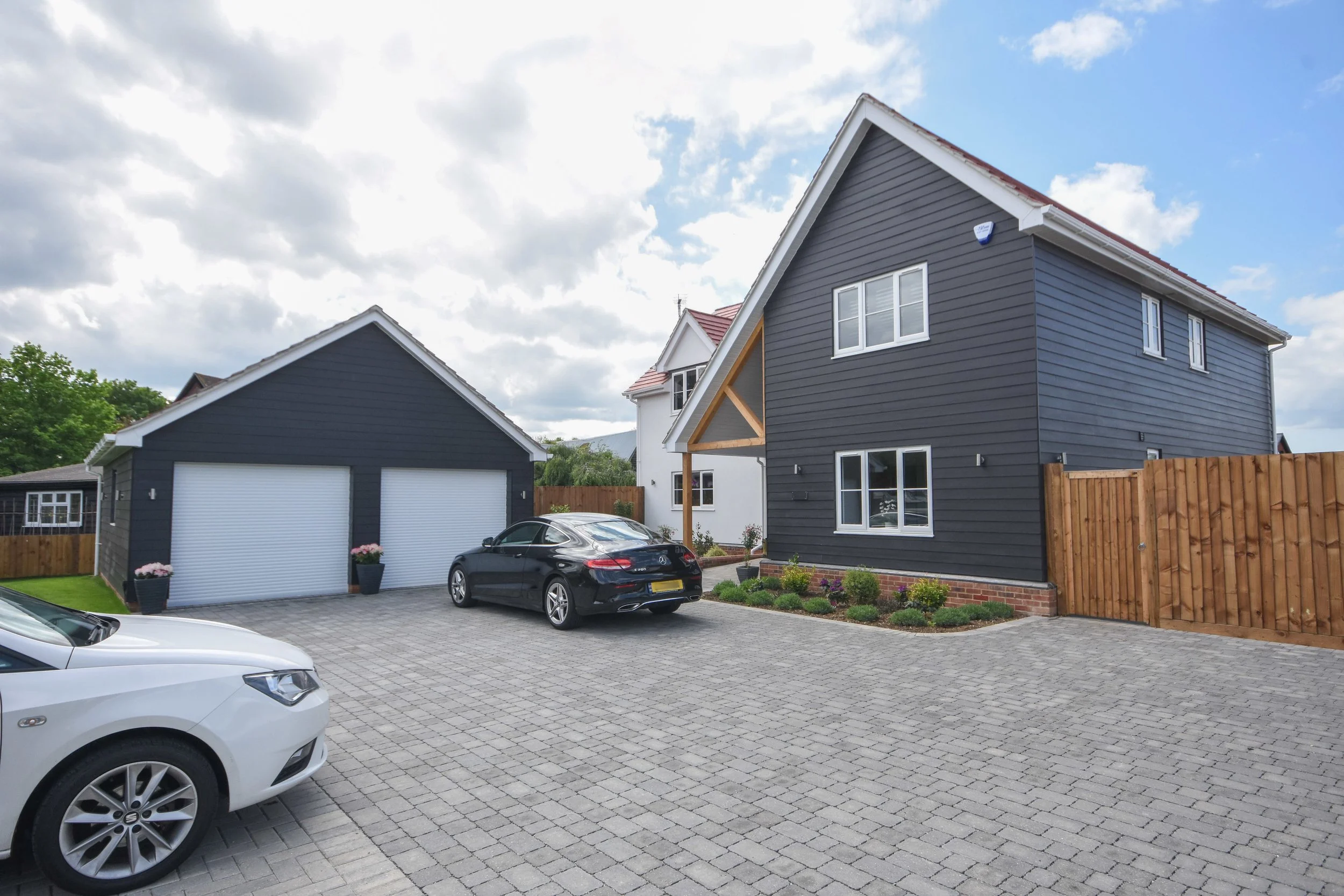 A contemporary family home extending to approximately 2,700 sq ft, The Hawthorns features a distinctive exterior of white render with blue cladding, a detached double garage, and a generous 800 sqm private garden. Designed with space and modern living in mind, the home combines bold architecture with practical family accommodation.